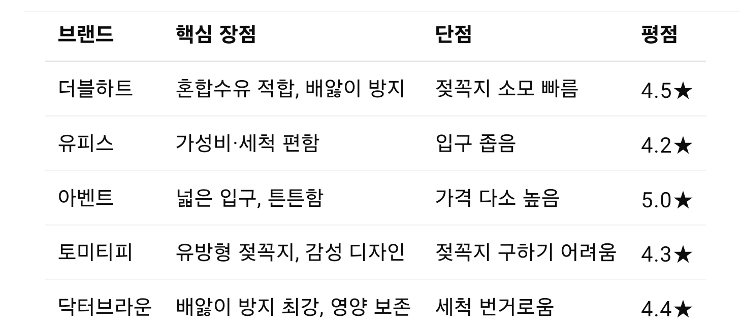 오늘은 실사용 리뷰와 육아 커뮤니티 반응을 종합해 젖병 TOP5 브랜드의 장단점을 브랜드별로 상세히 정리해봤어요.
